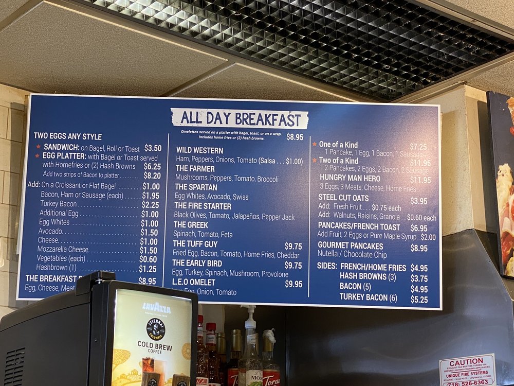 Choose three eggs, any style, three meats of your choice along with cheese and home fries on a hero.